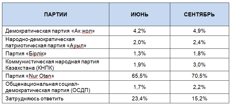 В рамках опросов июне и сентябре респондентам задавался вопрос: «Здесь перечислены зарегистрированные на данный момент партии, которые могут участвовать в парламентских выборах. Если бы выборы состоялись в ближайшие дни, тогда за какую политическую партию из этого списка вы бы проголосовали?». Результаты приведены в таблице.