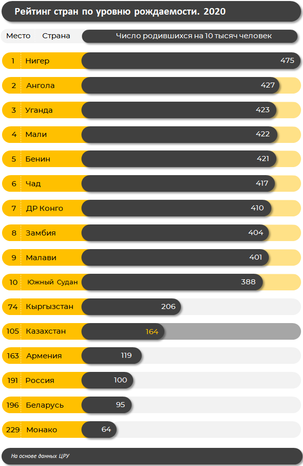 В рейтинге стран мира по уровню рождаемости, согласно данным ЦРУ, Казахстан занял 105-е место из 229. На 10 тыс. человек в стране приходится в среднем 164 родившихся. Об этом сообщили аналитики Finprom.kz, передает Kaznovosti.kz