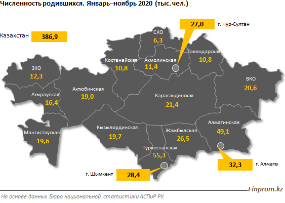 В региональном разрезе наибольшее число родившихся (14,3%) пришлось на Туркестанскую область: 55,3 тыс., плюс 8,5% за год. Следом идут Алматинская область (49,1 тыс. родившихся, плюс 6,4%) и Алматы (32,3 тыс., плюс 2,9%).