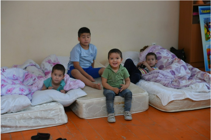 Также детвора устраивает игры внутри здания. Здесь в классах на полу разложили матрацы и организовали ночлег.
