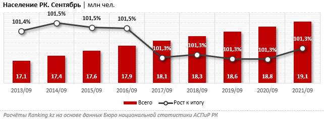 На 1 октября 2021 года в стране проживало 19,1 млн человек — на 1,3% больше, чем годом ранее. Для сравнения: в аналогичном периоде 2020-го в стране числилось 18,8 млн человек, плюс 1,3% за год, сообщают аналитики Ranking.kz