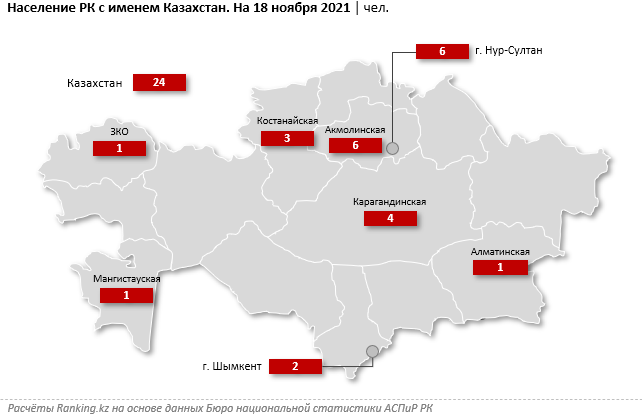 На 18 ноября 2021 года 24 человека в стране являлись тезками нашего государства, то есть носили имя Казахстан.