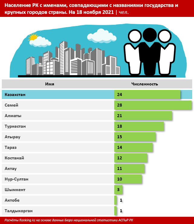 Казахстанцы называют детей и в честь крупнейших городов страны (в РК их 18). 28 человек в стране носят имя Семей, 21 — Алматы, 18 — Туркестан.
