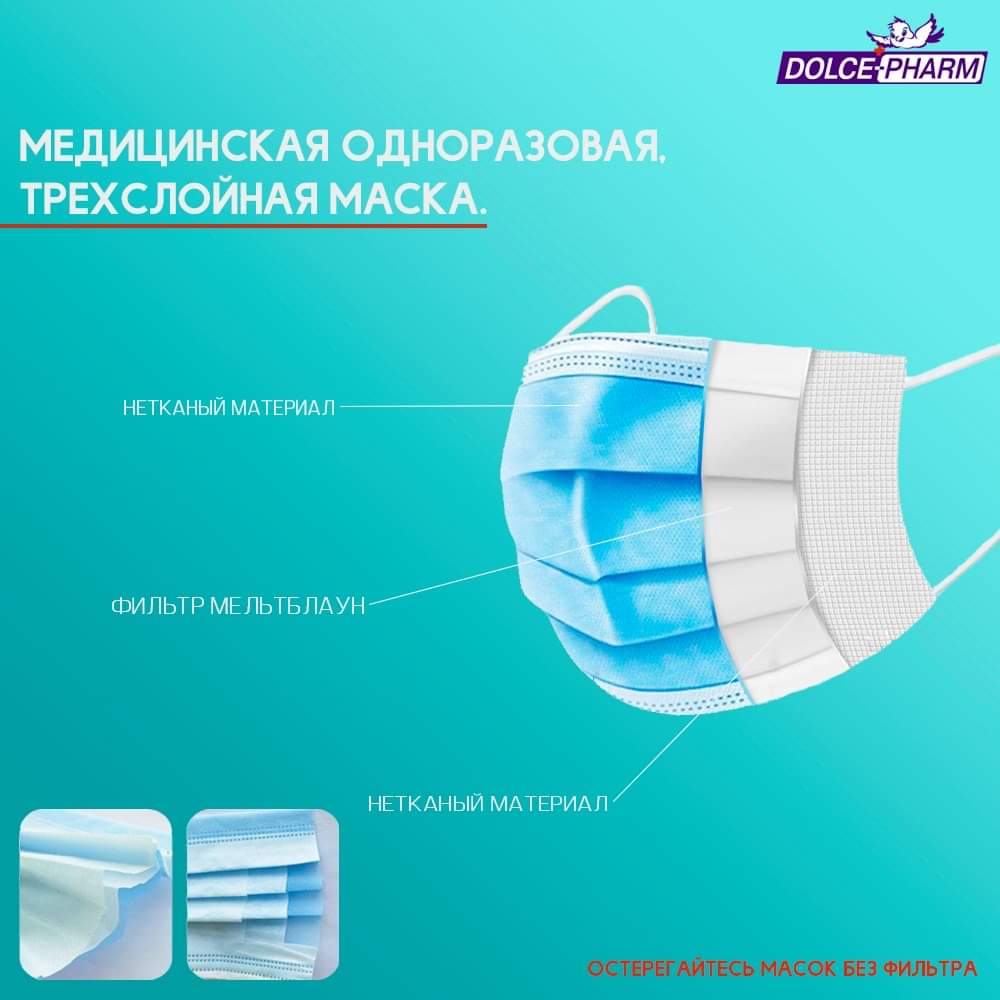Одноразовые маски состоят из 3-х слоев: ⠀1-й слой: нетканый материал (PP Nonwoven); 2-й слой: фильтр мельтблаун (Melt-Blown Filter); 3-й слой: нетканый материал (PP Nonwoven). Носовой фиксатор: гибкий пластиковый фиксатор с железной проволокой. Благодаря сложной технологии многослойной защиты маски обеспечивают высокий уровень защиты.